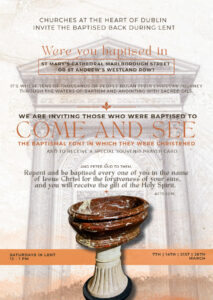 People from all over the country and indeed from abroad regularly call into both churches to see where they were baptised as babies. This year, St Mary’s Cathedral and St Andrew’s, Westland Row, are collaborating in an initiative to encourage people to come back to see where they were baptised, to reflect on their baptism and their lives since, and to take a moment to reconnect with their spiritual roots.