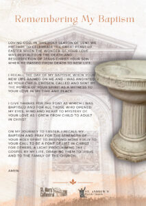 On my journey to Easter, I recall my Baptism and pray for the strength of your Holy Spirit to respond more fully to your call to be a font of life in Christ for others, a light proclaiming the Gospel by my life, drawing them to Jesus and to the family of the Church.