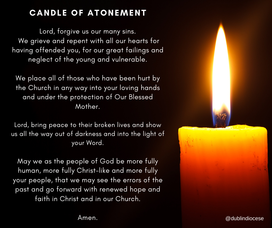 “The ‘Candle of Atonement’ and accompanying prayer are offered as a reminder to all of the need for us to atone, to ask forgiveness as a Church for the suffering caused by abuse. My hope is that these candles will be lit in Cathedrals and parishes across the country as a reminder of the need for atonement and that they will symbolise repentance, light in the darkness and hope.” Resources are available at www.catholicbishops.ie