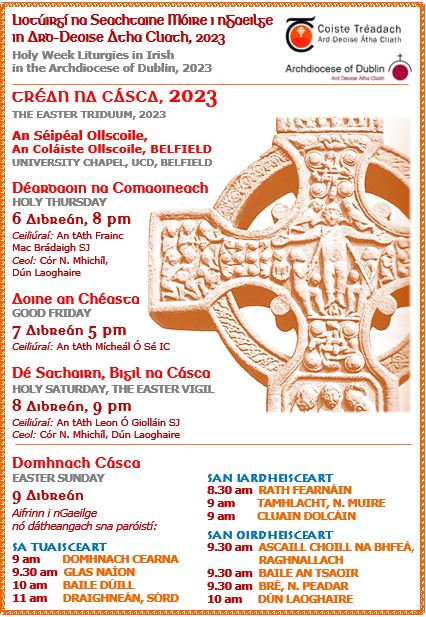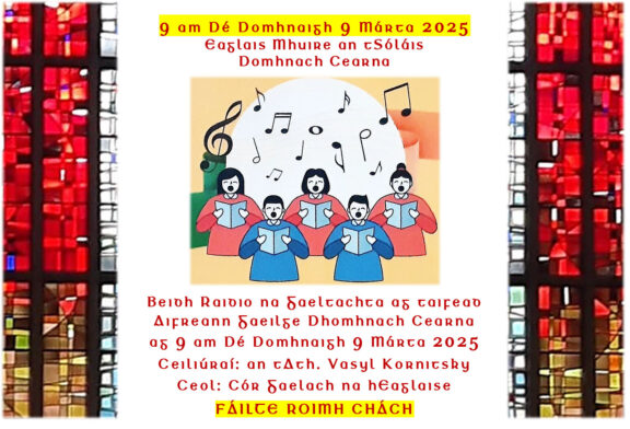 An Coiste, helped by the support society Pobal an Aifrinn, organises annual liturgies, including city centre weekday lenten Masses, and Holy Week and Christmas Eve liturgies for the north and south suburbs. Dublin’s Irish congregations retain a strong tradition of liturgical music, with, over the years, composers and choirs helping at various Masses. As a result, an Coiste is able to arrange for Raidio na Gaeltachta to broadcast Sunday Masses from churches in the Archdiocese six or more times a year.
