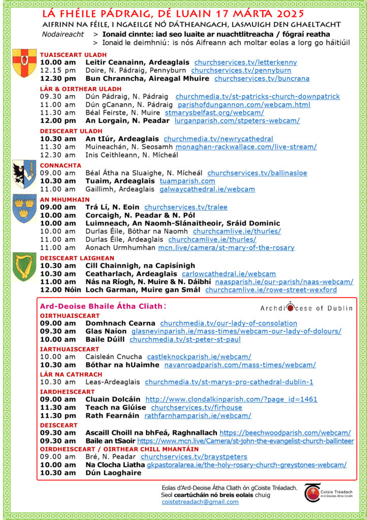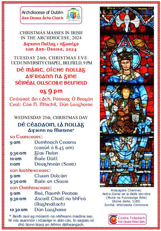In 2008 Archbishop Martin designated most of the Irish Masses in the Archdiocese as Aifrinn Dúiche [District Masses], each to serve about twelve parishes. This was a Sunday provision, with Holy Days in some cases. Where fluent local clergy are lacking, An Coiste assists in recruiting a rota of celebrants for these Masses. (At St. John the Evangelist’s Church, Ballinteer, the Mass is administered by An Coiste itself, which has charge of Mass collections and covers all costs.) Masses in Irish are also celebrated in other churches, sometimes monthly, on St. Patrick’s Day, for Gaelscoileanna, or at local Irish éigsí. An Coiste welcomes all such initiatives.