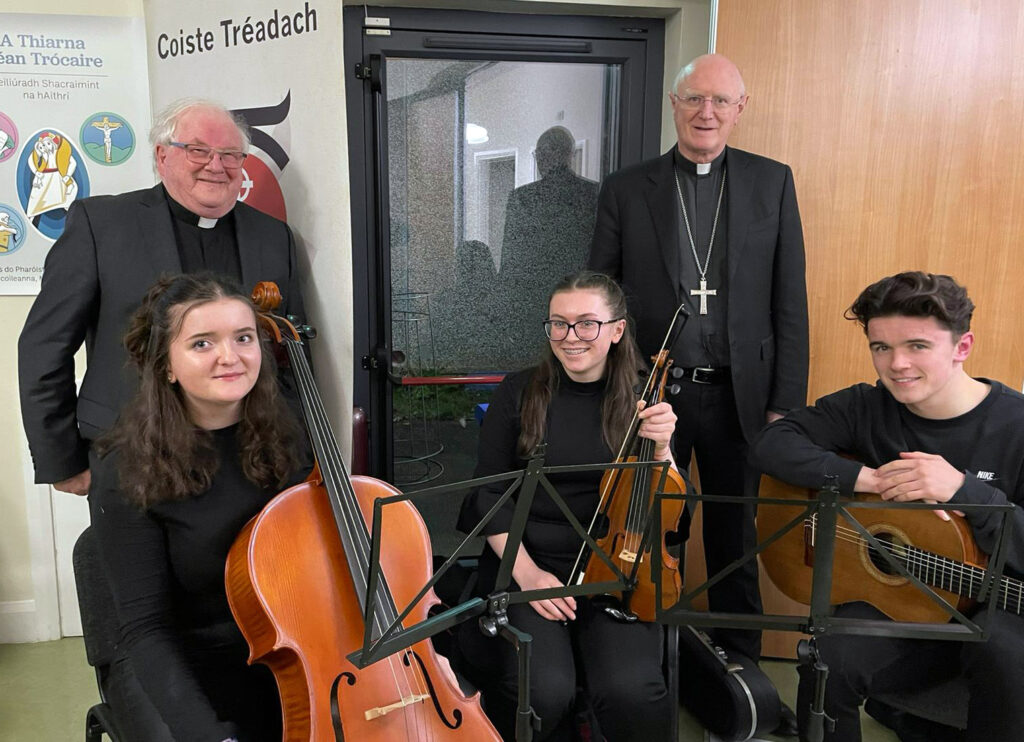 An tArdeaspag leis an Canónach Pádraig Ó Baoill agus na ceoltóirí Róisín, Muireann agus Dónal Ó Dúghaill ag seoladh A Thiarna Déan Trócaire, i mBaile Breacáin, Samhain 10, 2023. / Archbishop Farrell with Canon Paddy Boyle (Chair, An Coiste Tréadach) and the Ó Dúghaill family musicians at the launch in Brackenstown, November 10, 2023, of A Thiarna Déan Trócaire, a resource for teachers and parents of children in the Gaelscoileanna preparing for First Confession.