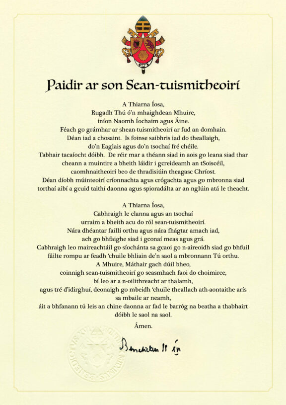 When Cardinal Connell established An Coiste Tréadach in the year 2000, he asked the members to make practical recommendations to assist him and his successors, with the help and permission of the parishes, to provide church ministry, willingly and professionally, as of right, to the Irish Language Community in the Archdiocese. Bishop Fiachra Ó Ceallaigh OFM was An Coiste’s founding chair. He was succeeded by Sr. Eilís Ní Thiarnaigh, then by Fr. Pádraig Ó Cochláin, and in 2017 by Fr. Pádraig Ó Baoill. An Coiste meets about eight times a year. Members include clergy, religious, and laity, familiar with Irish medium education, youth chaplaincy, publishing, and the fostering of liturgical participation.