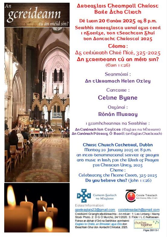 Each January, An Coiste arranges for a priest to co-preside on behalf of the Archbishop at the annual service in Irish for Christian Unity in Christchurch Cathedral. Pobal an Aifrinn and, for the Church of Ireland, Cumann Gaelach na hEaglaise, help organise the service. A Catholic priest gives the sermon in alternate years. (In 2021 & 2022 due to the pandemic, virtual services were held.)