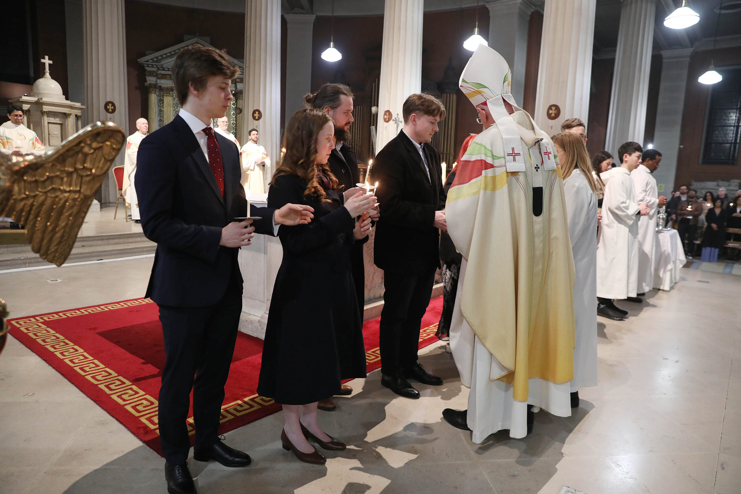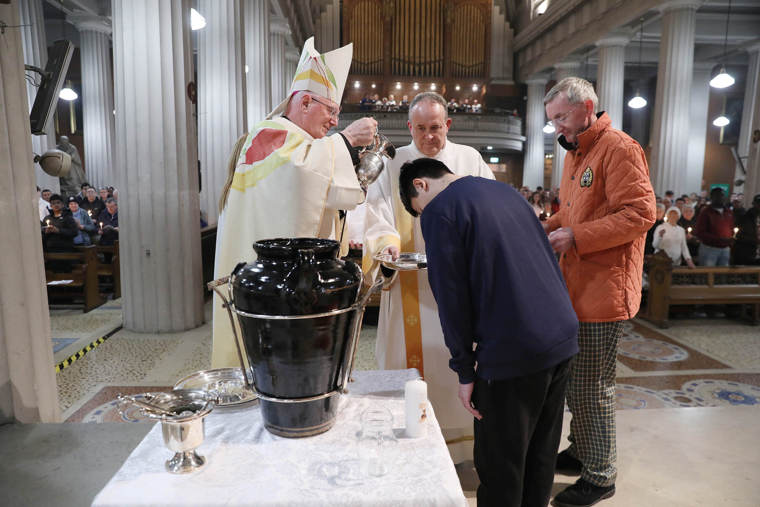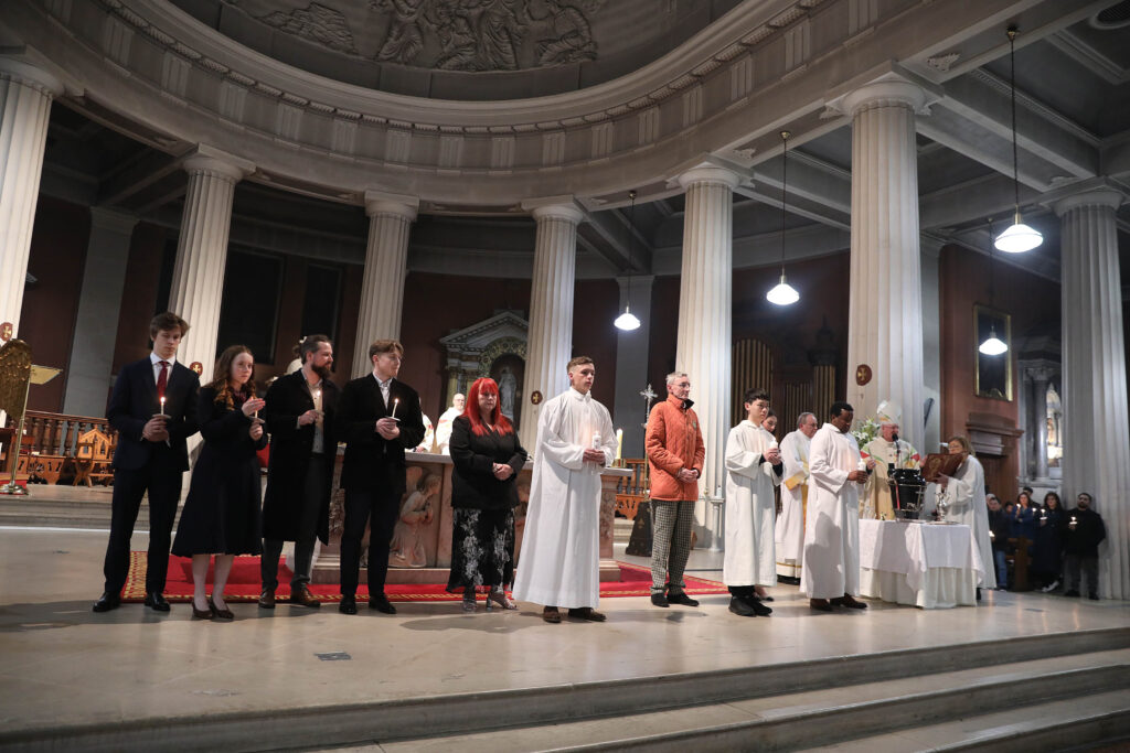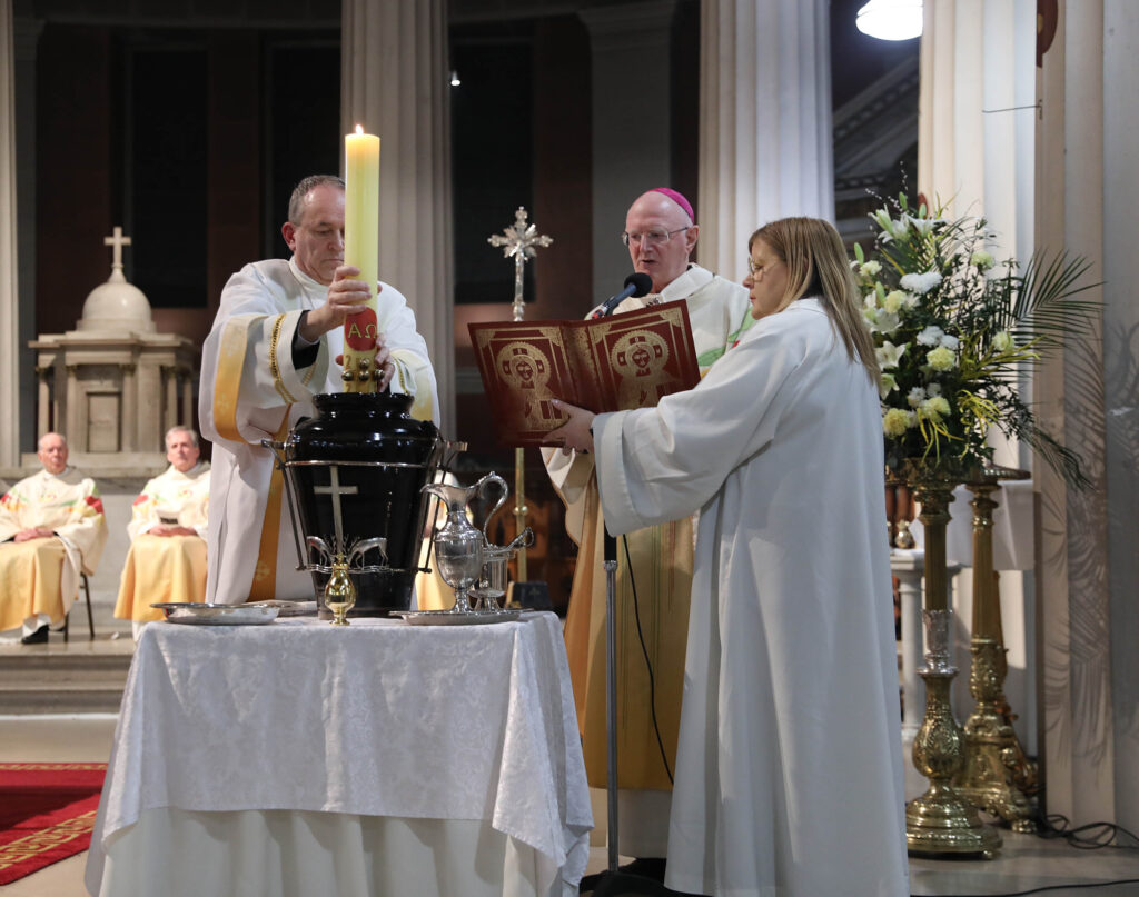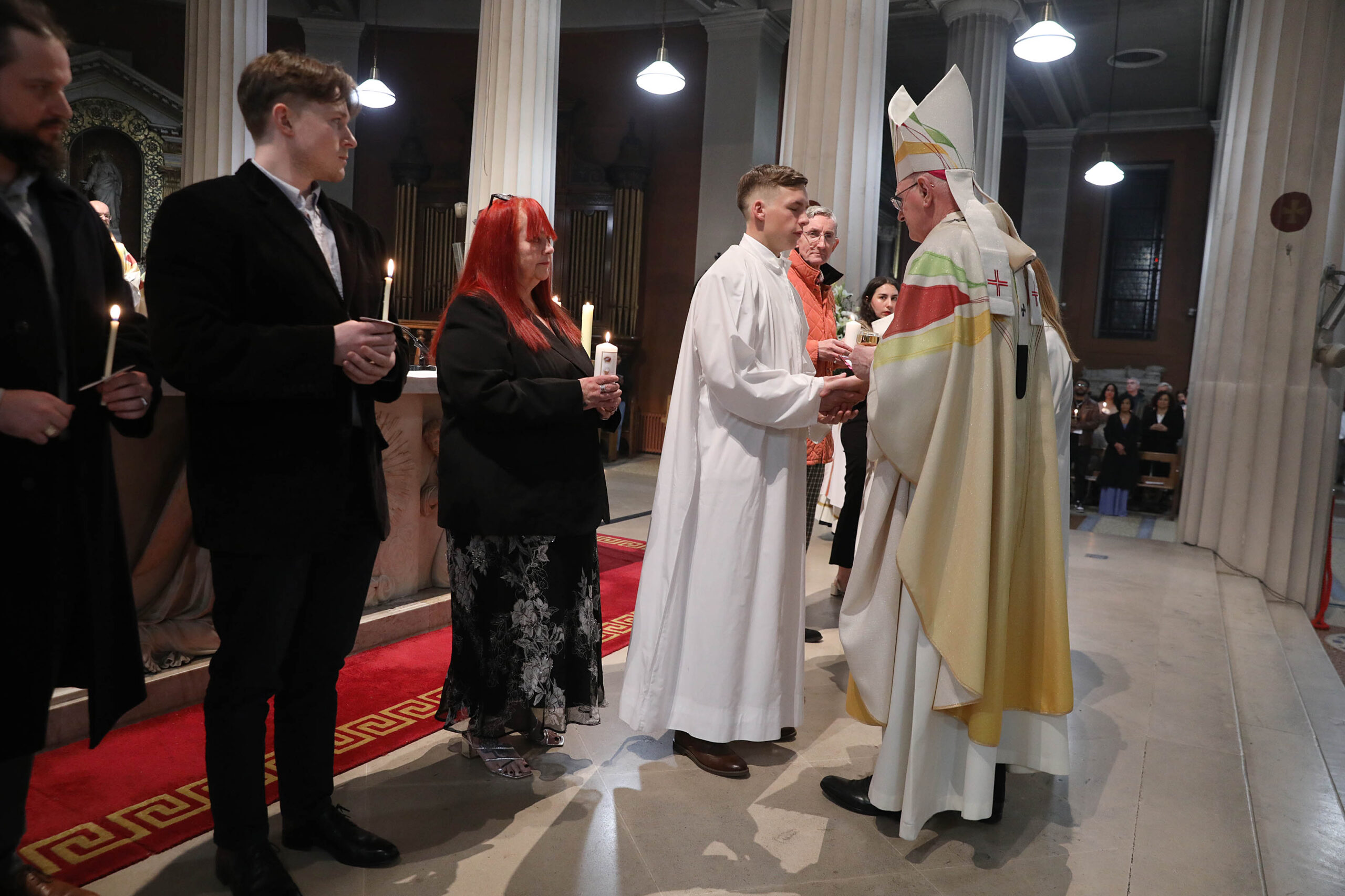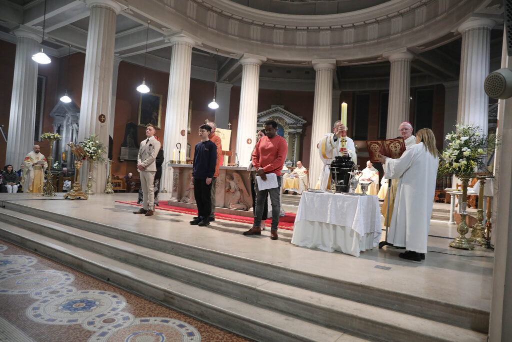 Archbishop Farrell led the celebration of the Easter Vigil in St Mary’s Cathedral, Dublin. The ceremony began with the lighting of the Paschal fire at the entrance to the Cathedral, where the Archbishop was assisted by Deacon Thomas Groves. During the Mass, three catechumens were baptised and confirmed into the Catholic faith: Zhao Zhang, who was baptised with the Christian name Thomas, Mamadu Sow, baptised with the Christian name John, and Charlie Pooley. Two other candidates also received the sacrament of Confirmation. The Palestrina Choir provided the music for this joyful celebration of Christ’s Resurrection.
