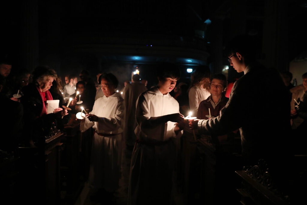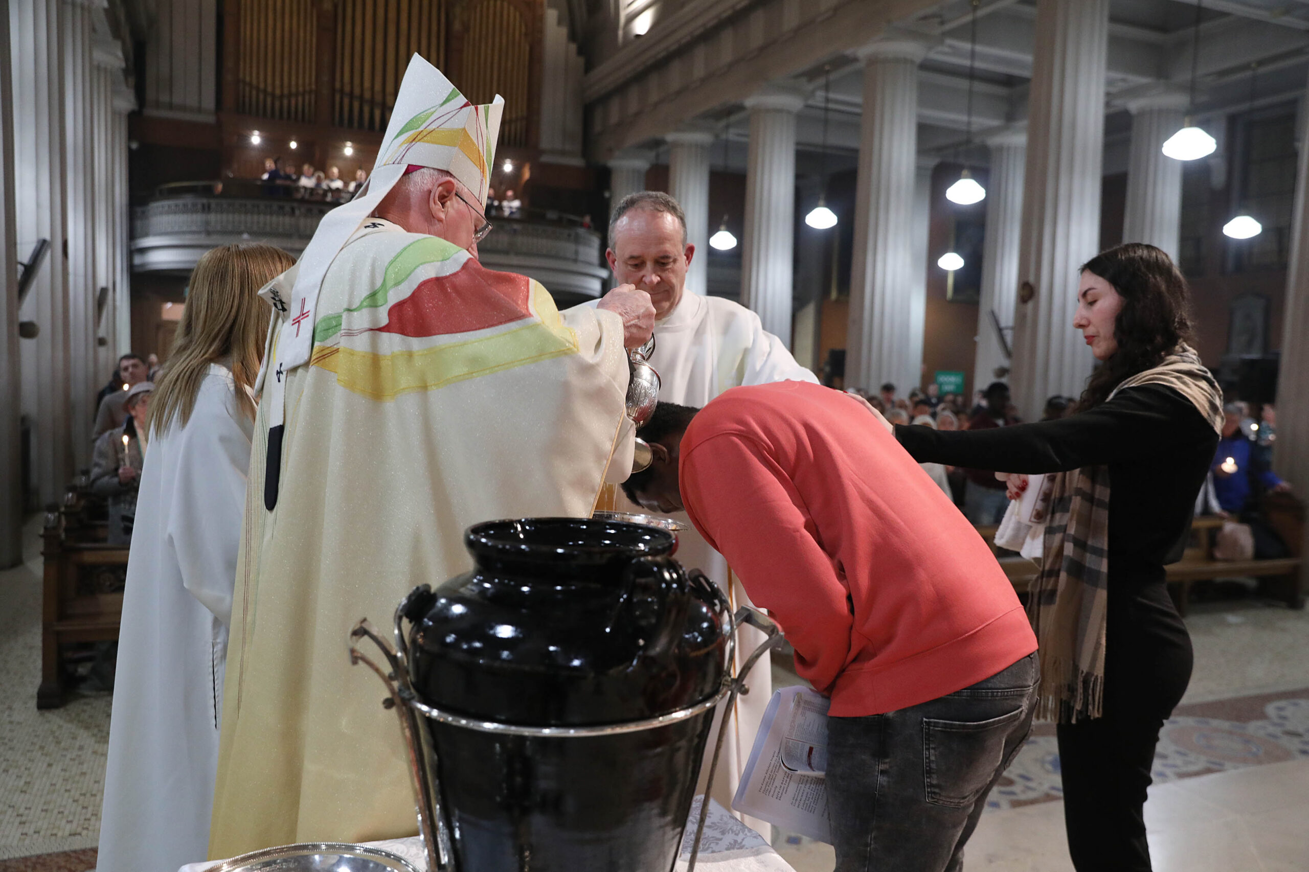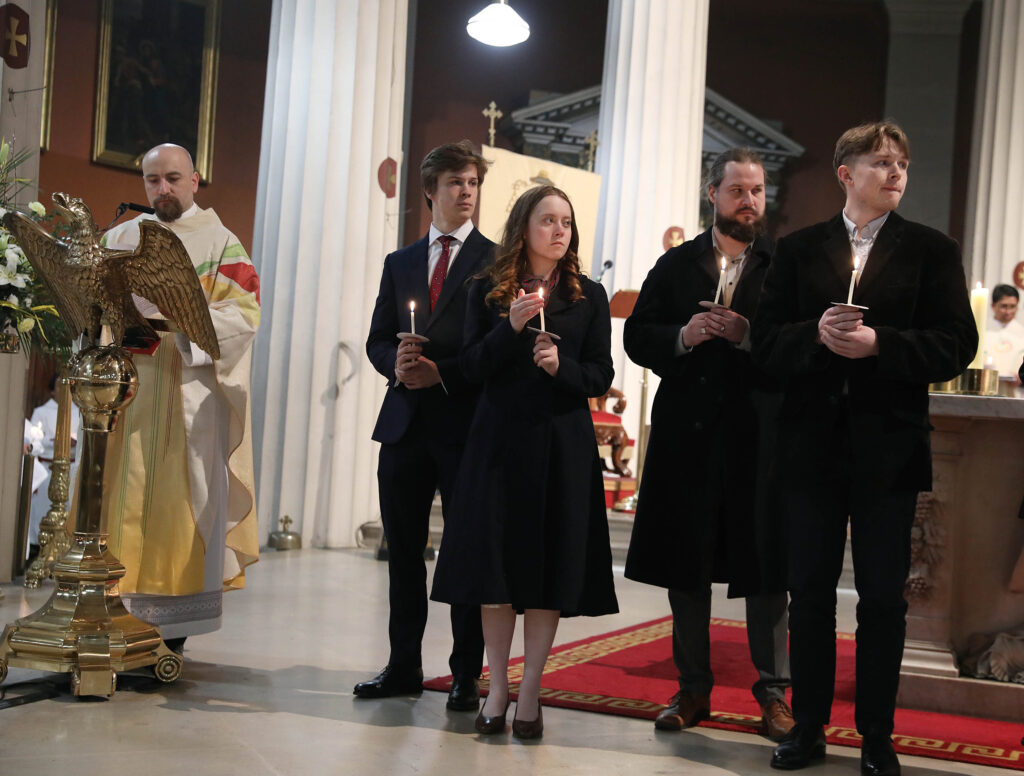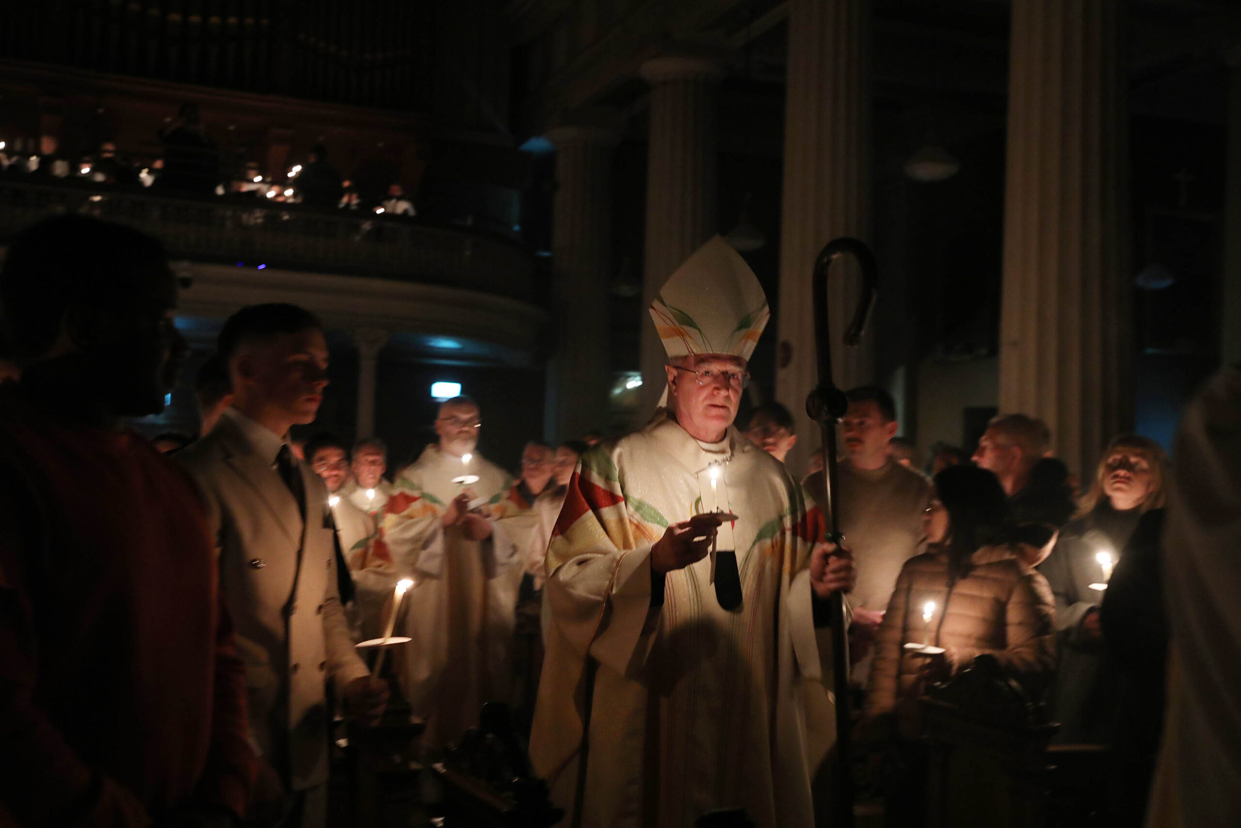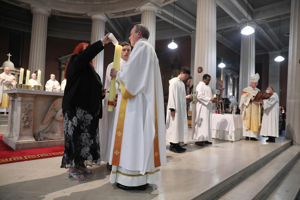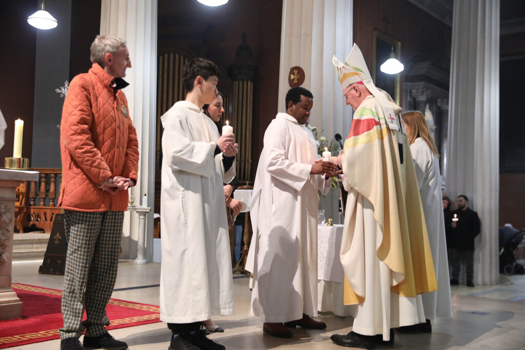 Archbishop Farrell led the celebration of the Easter Vigil in St Mary’s Cathedral, Dublin. The ceremony began with the lighting of the Paschal fire at the entrance to the Cathedral, where the Archbishop was assisted by Deacon Thomas Groves. During the Mass, three catechumens were baptised and confirmed into the Catholic faith: Zhao Zhang, who was baptised with the Christian name Thomas, Mamadu Sow, baptised with the Christian name John, and Charlie Pooley. Two other candidates also received the sacrament of Confirmation. The Palestrina Choir provided the music for this joyful celebration of Christ’s Resurrection.