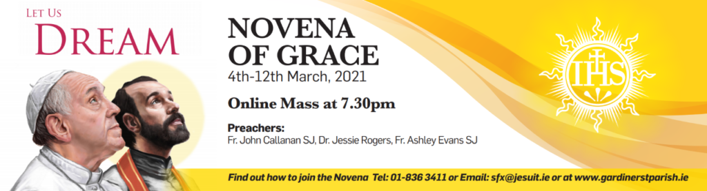 We are pleased to announce that the Novena of Grace is going ahead as usual on 4th March 2021. This year we will have one evening Mass at 7.30pm.  It will be online only (given the restrictions). During Lockdown Pope Francis has invited us to dream … what have we learned from this pandemic and what kind of people can we be after it? Our preachers; Fr. John Callanan SJ, Dr. Jessie Rogers and Fr. Ashley Evans SJ, will help us understand our lockdown experience and prepare us for the future.