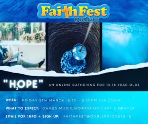Faithfest is back!! Join us for an evening of games, music, workshop, chats and prayer. Faithfest will take place 5 March from 6:30 – 8:30 online. You can register online using this link: https://forms.gle/DwKDsXCuTornHFYA8. For more information email: faithfest@dublindiocese.ie