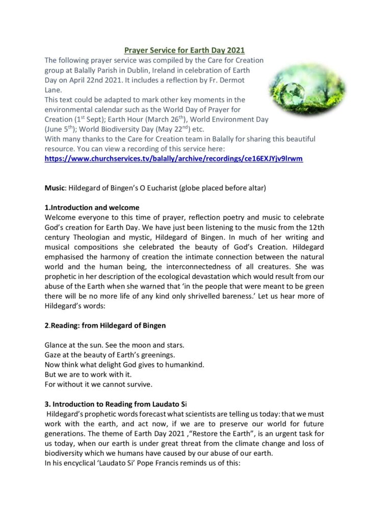 (This beautiful service was compiled by Balally Parish to celebrate Earth Day in 2021 but could be adapted and used as part of any Season of Creation event. It includes a reflection by Father Dermot Lane.)